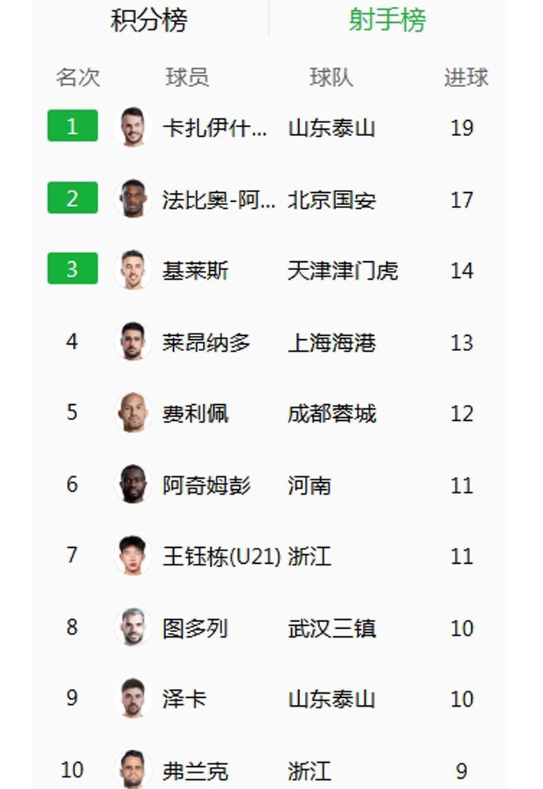 联赛23轮战罢,卡扎伊什维利为泰山队打进19球,超过国安外援法比奥-阿布雷乌(17球)、津门虎前锋基莱斯(14球),排名射手榜第一。虽然瓦科此前表示,没想过争夺中超金靴,球队取得更多胜利最重要,但是这么好的机会摆在面前,必将全力争取。况且,金靴和球队进步不矛盾。
